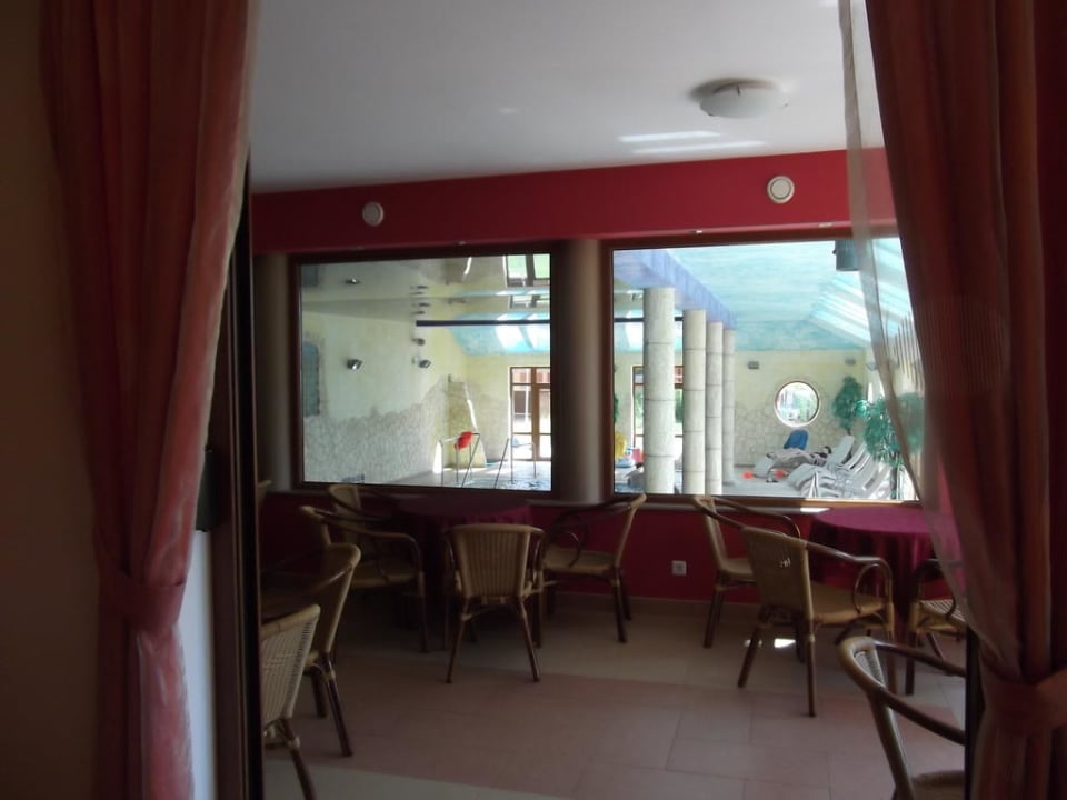 Blick vom Restaurant in die überdachte Poolanlage