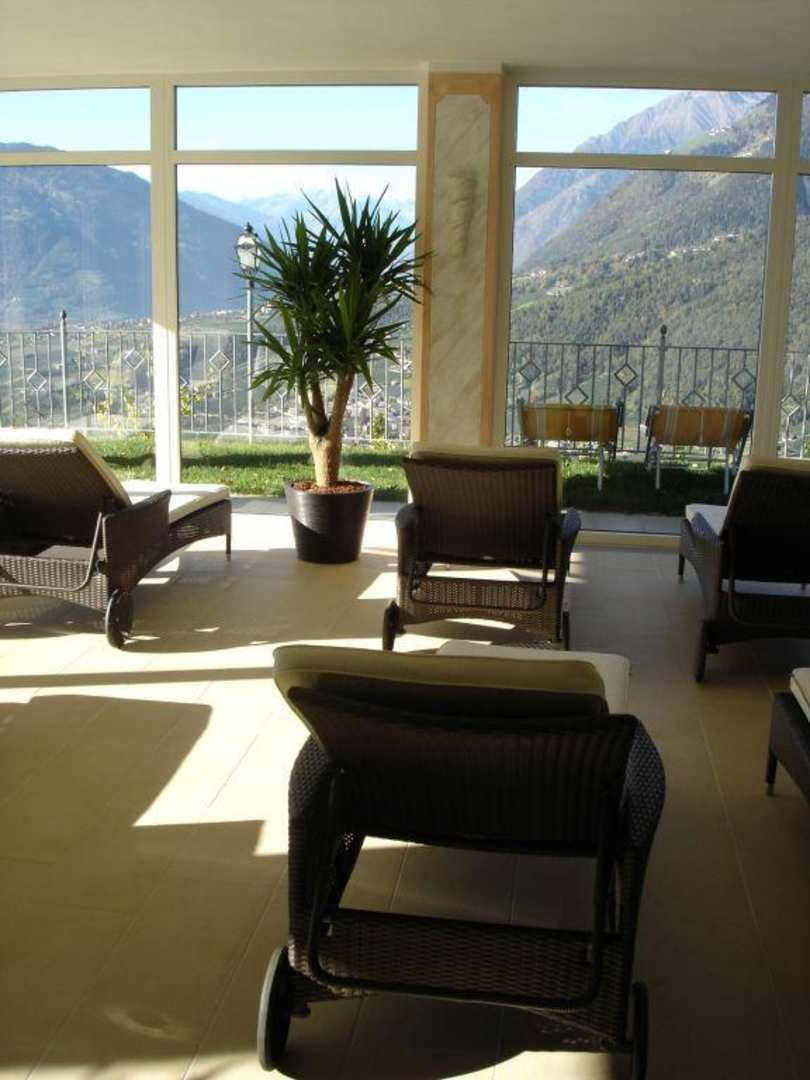 Ruhebereich der Wellnesslandschaft mit Blick auf das Bergpanorama
