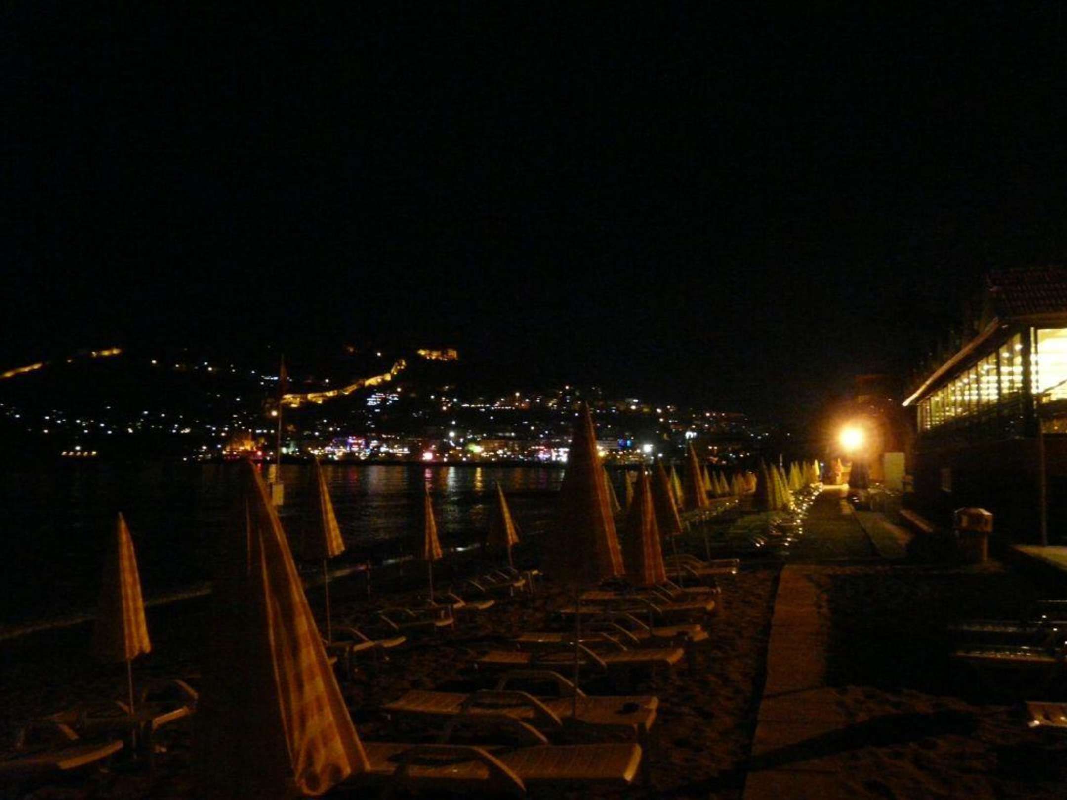 Blick auf Strand und Hauptgebäude und Burgberg