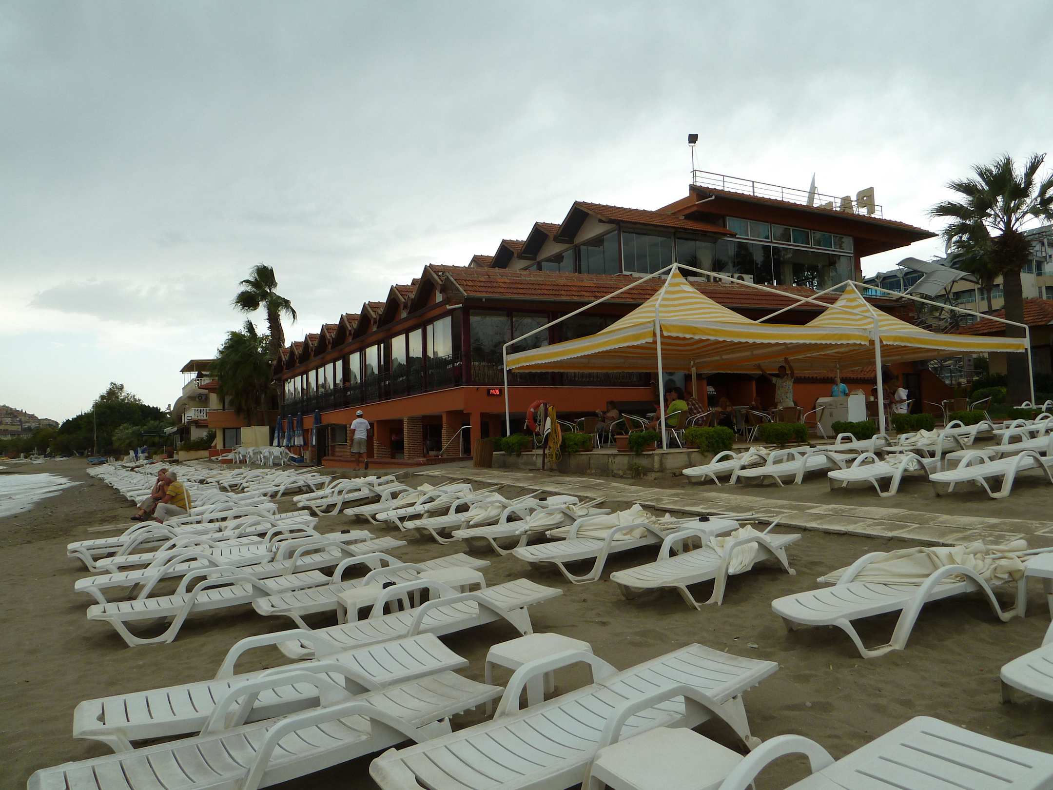 Blick auf den Hotelstrand,Standbar und Haupthaus bei schlechtem Wetter.