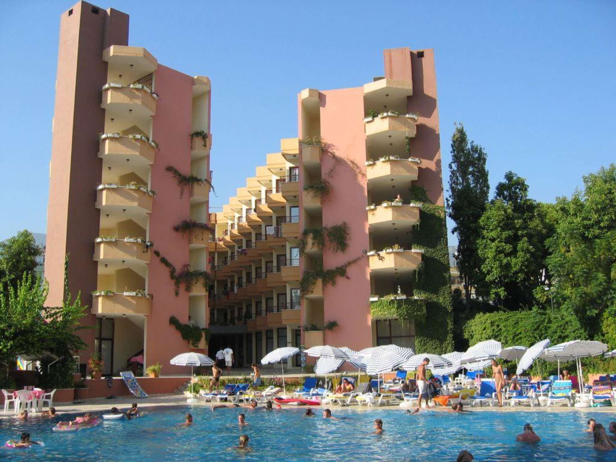 Haus an der Landseite mit Pool, unten Massagepraxis, Fitness, Sauna. Vor dem Gebäude findet abends Animation statt, links (nicht mehr im Bild) ist direkt die Poolbar