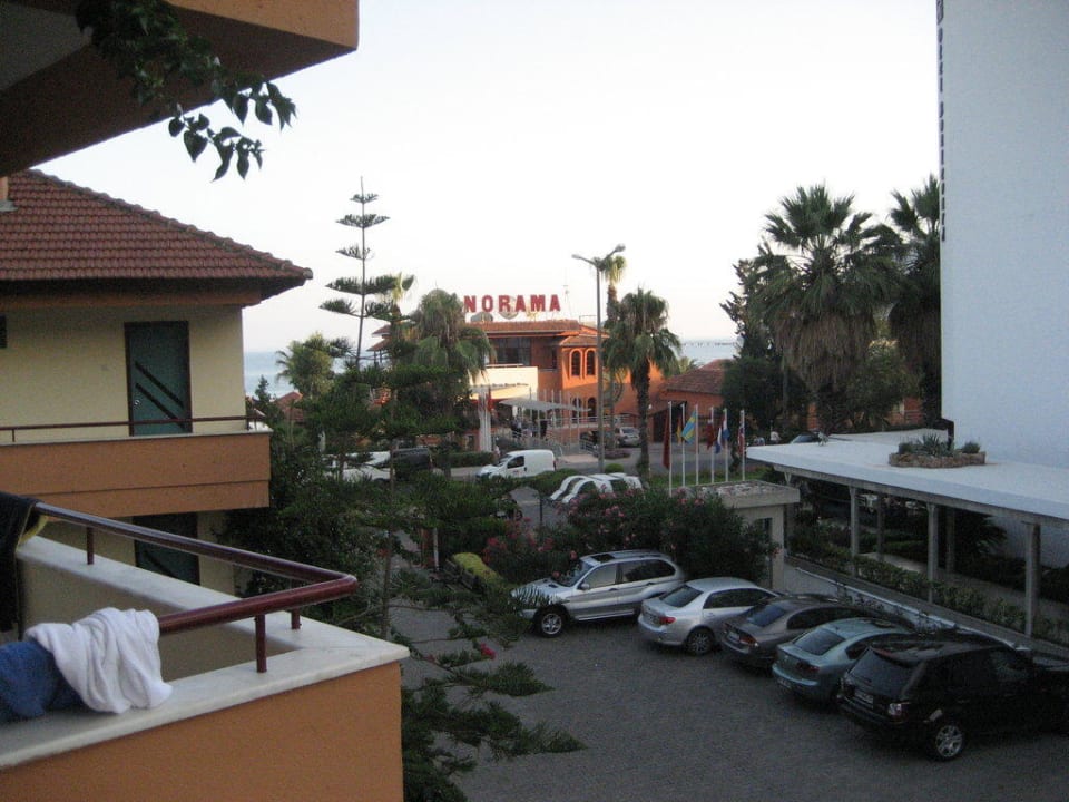 Im Hintergrund sieht man das Hauptgebäude (Restaurant). Dazwischen zu sehen ist die Hauptstraße die man überqueren muss um an den Strand zu gelangen.