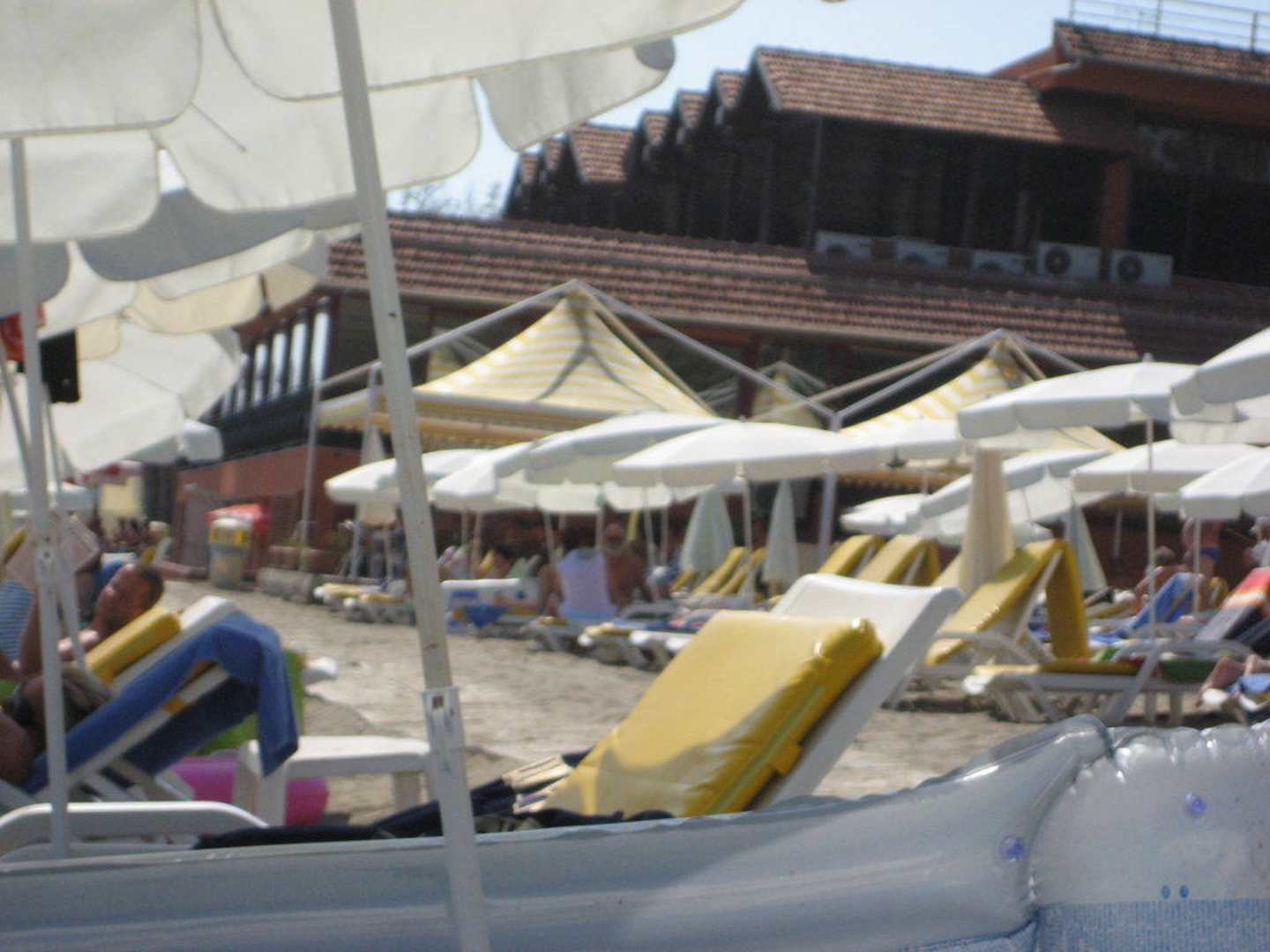 StrandDer Hotel-Strand war mit Liegen und Sonnenschirmen ausgestattet. Das Gebäude im Hintergrund ist das Restaurant.