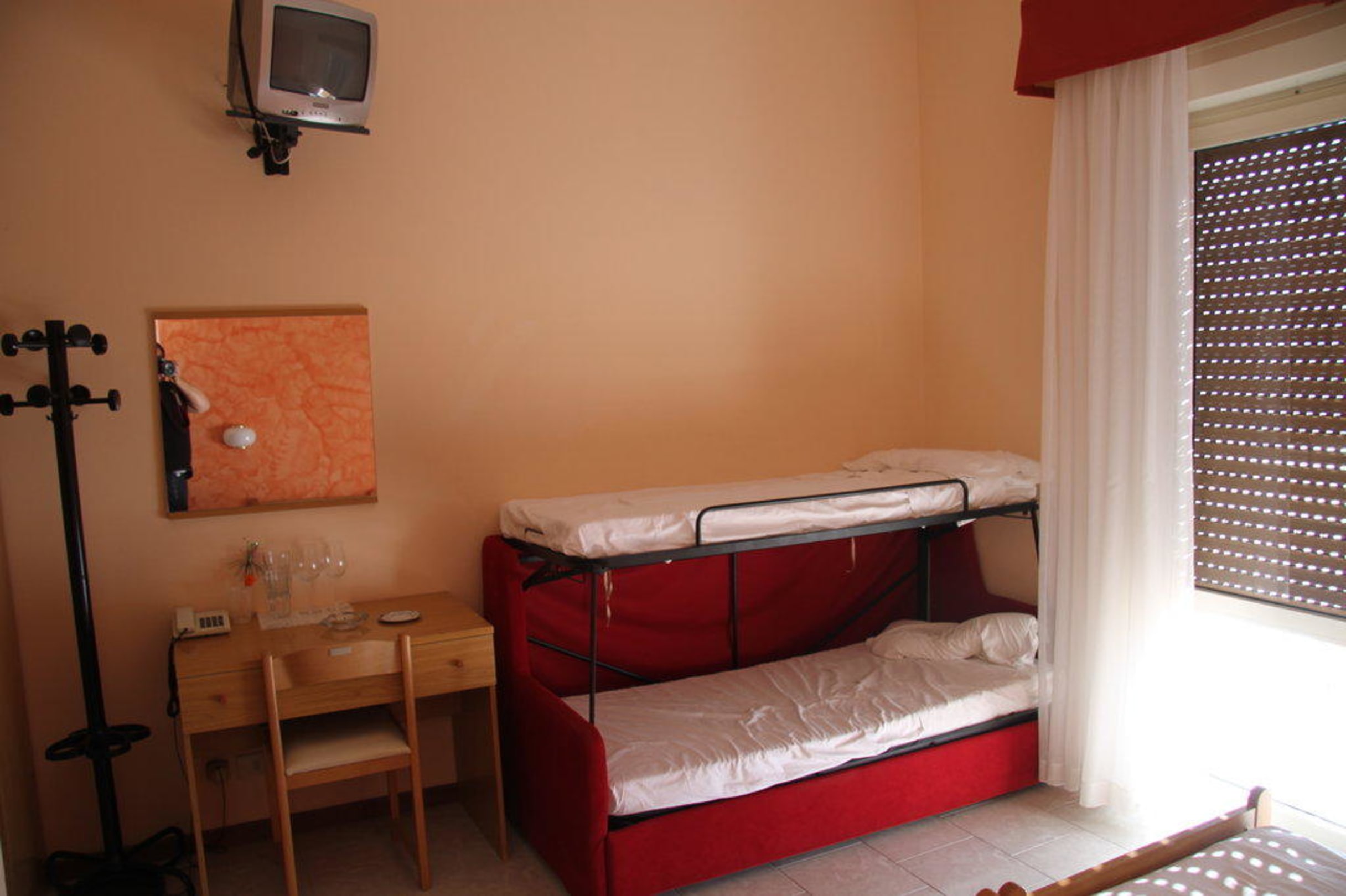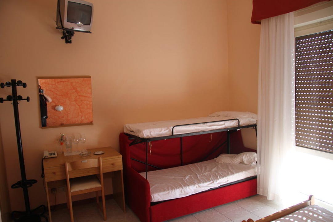 Stockbett bei 4er BelegungFür die beiden Kids 11 u. 16 Jahre gab's dieses Bett. Metalstreben links u. rechts wackelten u. wurden auch mit keinerlei Schraube oder sonstigem gesichert. ich hab dann meine Schnürsenkel aus den Turnschuhen benutzt um das Gestänge zu sichern !