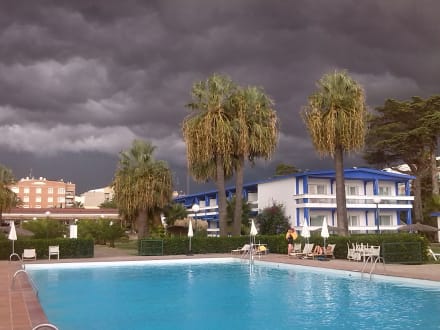 Blick von der Meerseite beim Aussentor auf den kurzen Nordflügel - im Unwetter. Links geht es zum Hauptteil des Palmengartens mit dem langen Südflügel