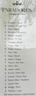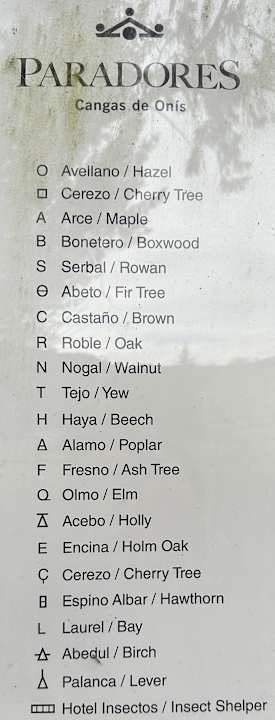 Baum-Namen auf Spanisch und Englisch im kleinen Arboretum des Paradors