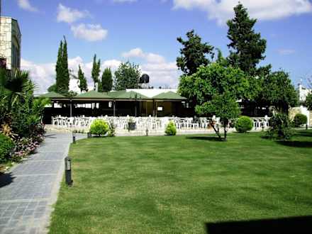 Gartenanlage, im Hintergrund der Bereich für Mittag- und Abendessen vom Buffet.