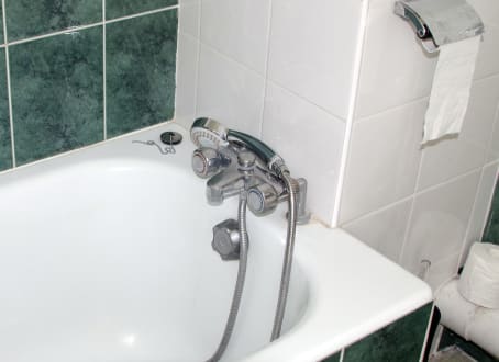 Für den Duschkopf gibt es keine Aufhängung an der Wand - und der Wasserdruck ist sehr gering.