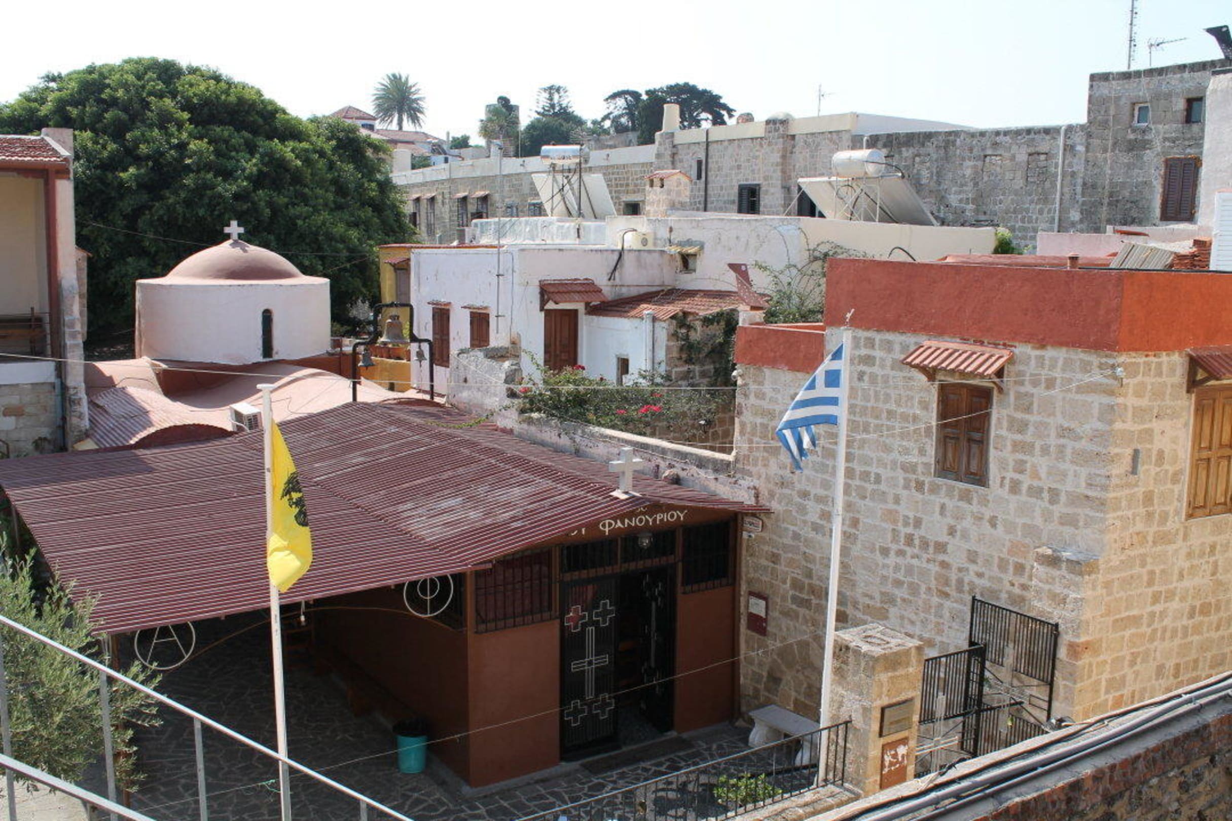 Blick vom Laubengang vor dem ZimmerDirekt gegenüber vom Hoteleingang liegt die sehr alte und sehenswerte Kirche Agios Fanourios.