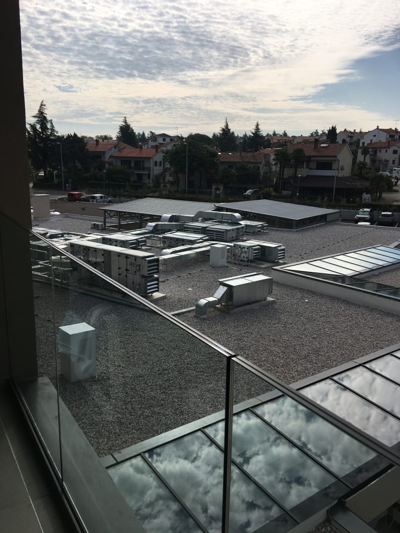 Nicht ganz so schöner Ausblick auf das Flachdach. Vor allem weil die Aggregate relativ laut sind - da sitzt man nicht so gern auf dem eigentlich schönen Balkon.