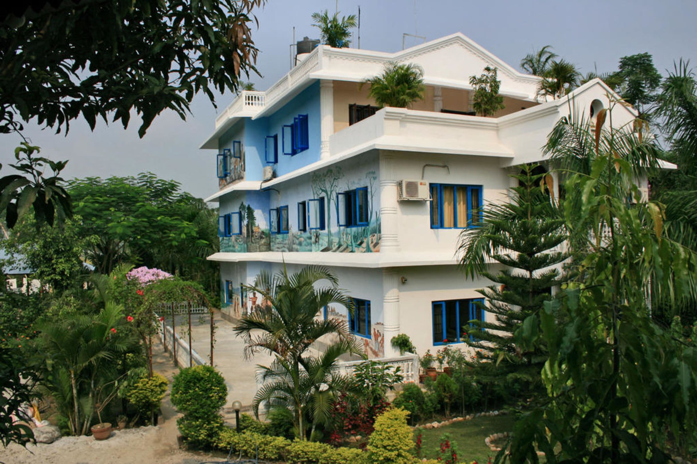 Das Familienhotel Parkside ist mit Szenen aus dem nepalesischen Leben bemalt und liegt in einem gepflegtem Hausgarten..
