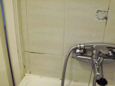 Löcher an der Wand im Badezimmer bei der Badewanne wurden einfach zugestopft.