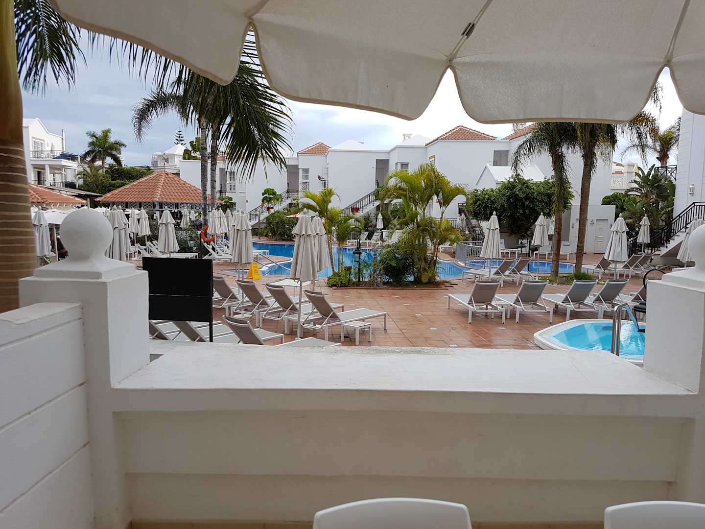 Aussicht vom Balkon auf den Pool.
