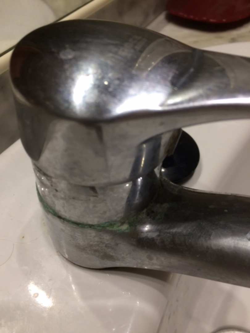 Bad: Vorderseite des Wasserhahns vom Waschbecken- über und über mit Grünspan bedeckt und Wasserhan sieht auch nach der Zimmerreinigung nicht anders aus.
