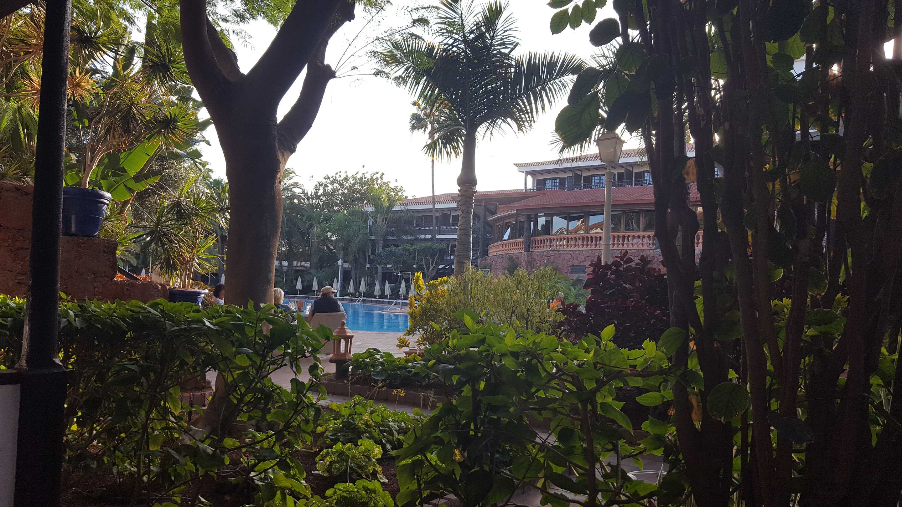 Blick von Terasse eines Parterrezimmers in den Garren-/ Poolbereich