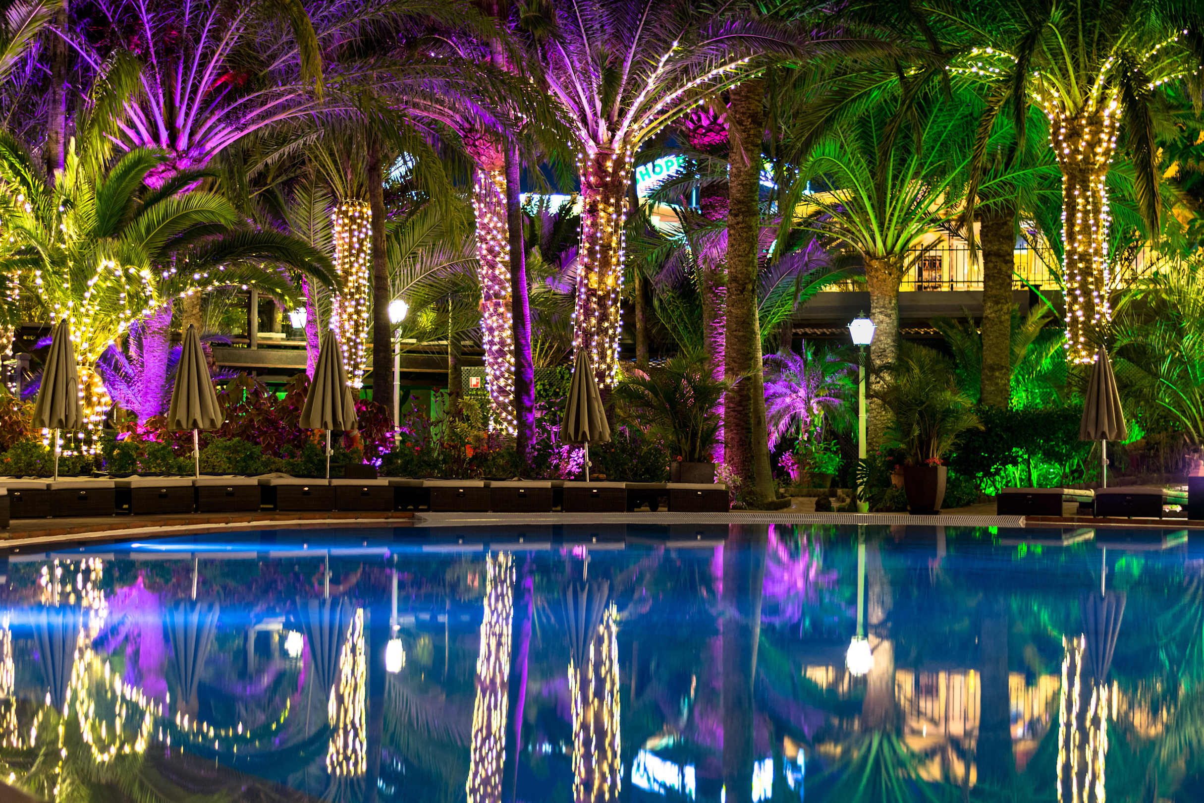Pool und Gartenanlage bei Nacht