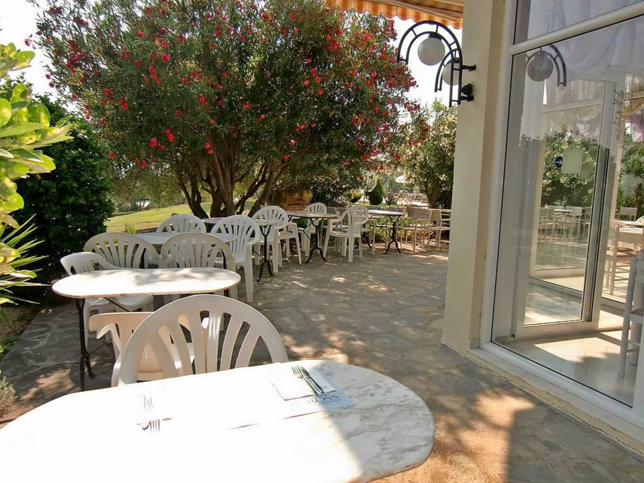 Außenterrassehier kann man mit Blick über die Anlage auf das Meer wunderbar frühstücken und zu Abend essen