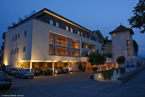 Auch am Abend sieht die Rückseite des Hotels mit Eingang und Zufahrt zur Tiefgarage mit großzügig dimensionierten Parkflächen sehr einladend aus.