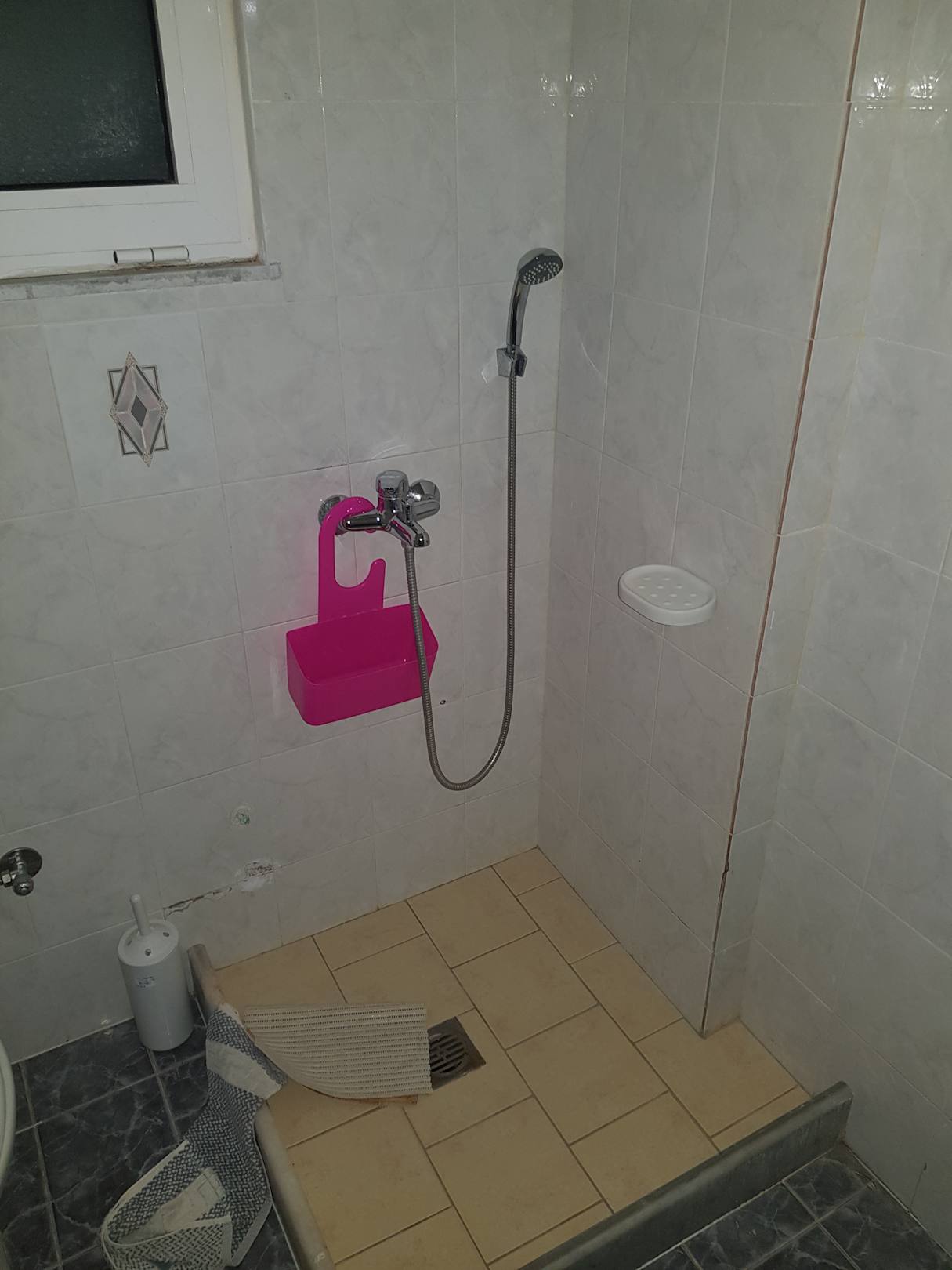 Dusche, ohne Vorhang mit kaputten Fliesen