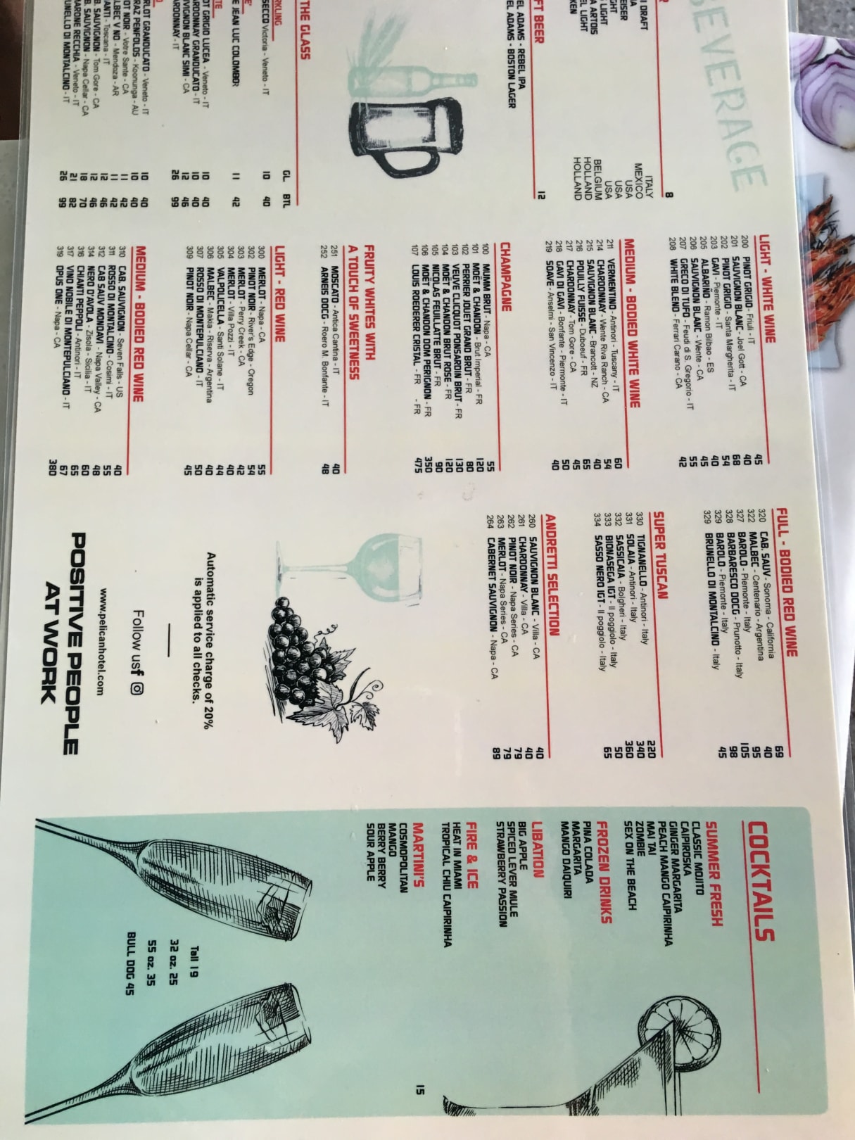 Getränkekarte, dazu kommt noch die TAX und 20 % Servicecharge