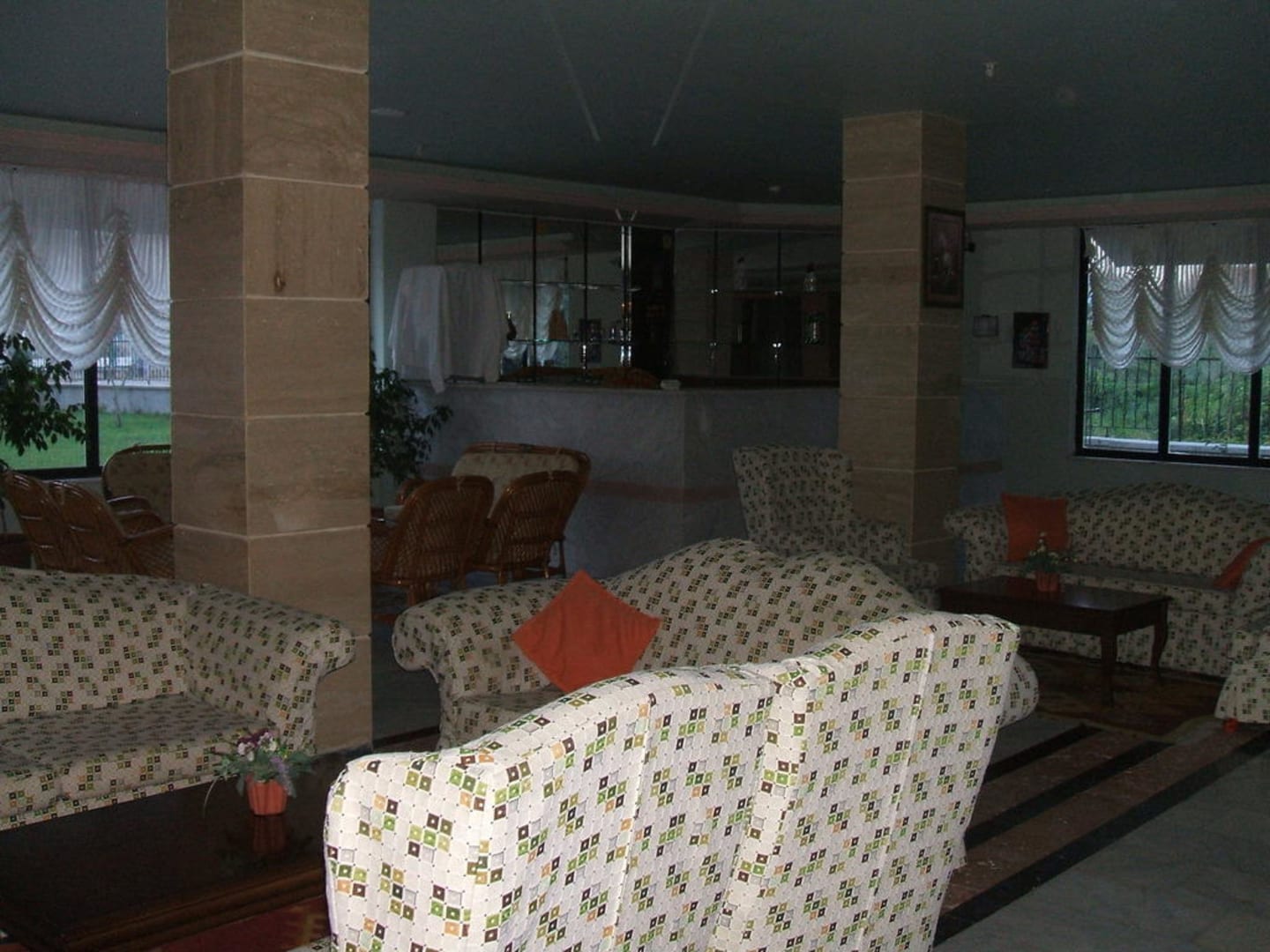 "Wohnzimmer" des Hotels mit Sitzgelegenheiten, Bar und Fernseher.