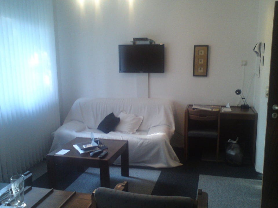 Hier sieht man die Sitzecke mit Schreibtisch und den Fernseher