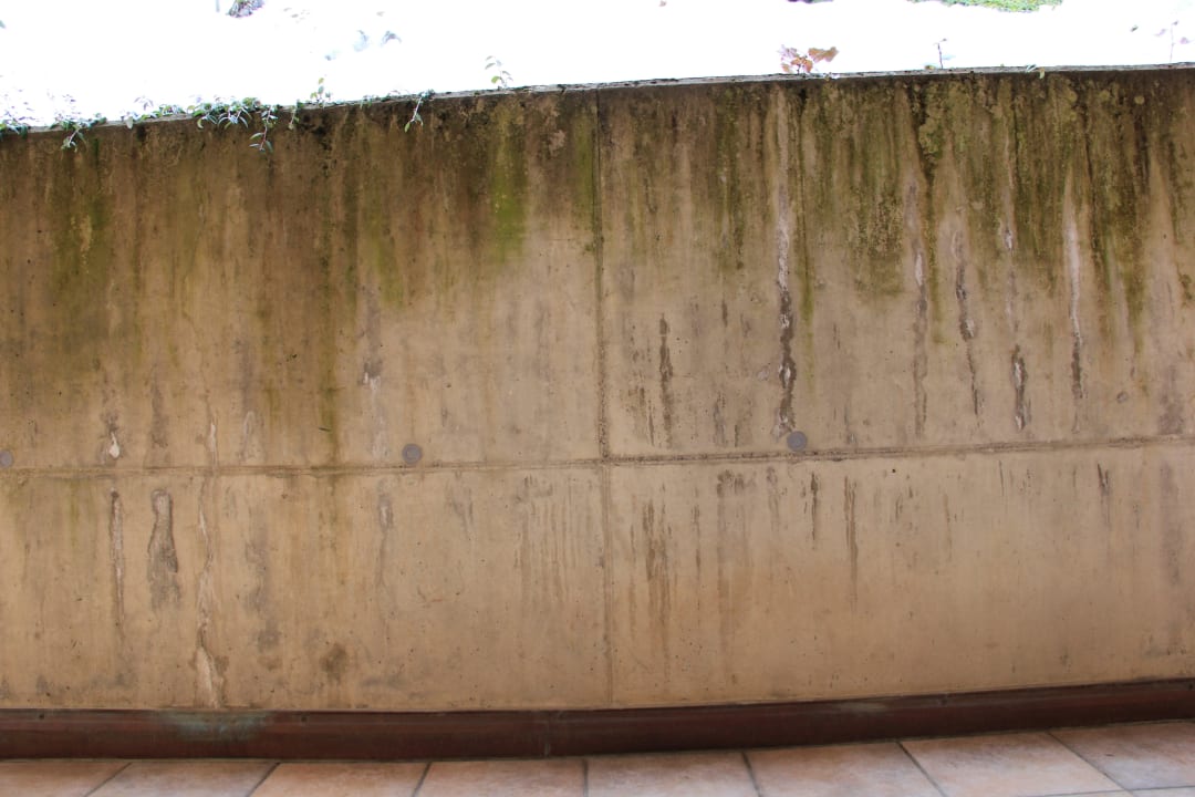Ausblick auf vermoste Betonmauer, Zimmer dadurch sehr dunkel