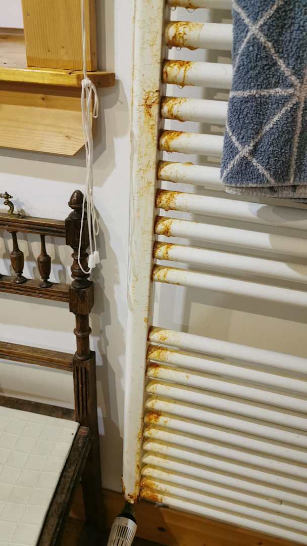 Rostiger, undichte Heizkörper auf dem trotzdem die frischen Handtücher angeboten werden