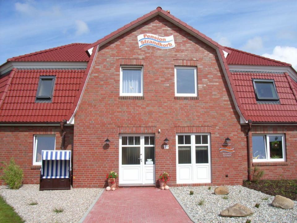 Eingang der Pension StrandkorbIn Deich- und Strandnähe ist dieser Neubau 2007 mit 25 Betten ausgestattet. Helle, freundliche Räume und zeitgemäße Bäder sind ebenso selbstverständlich, wie ein Garten mit Liegewiese, Terrasse, Fahrradunterstand und Parkplatz. Kostenlos: Tee, Kaffee, Obst, Bollerwagen, Video, Bücher u. v. m.