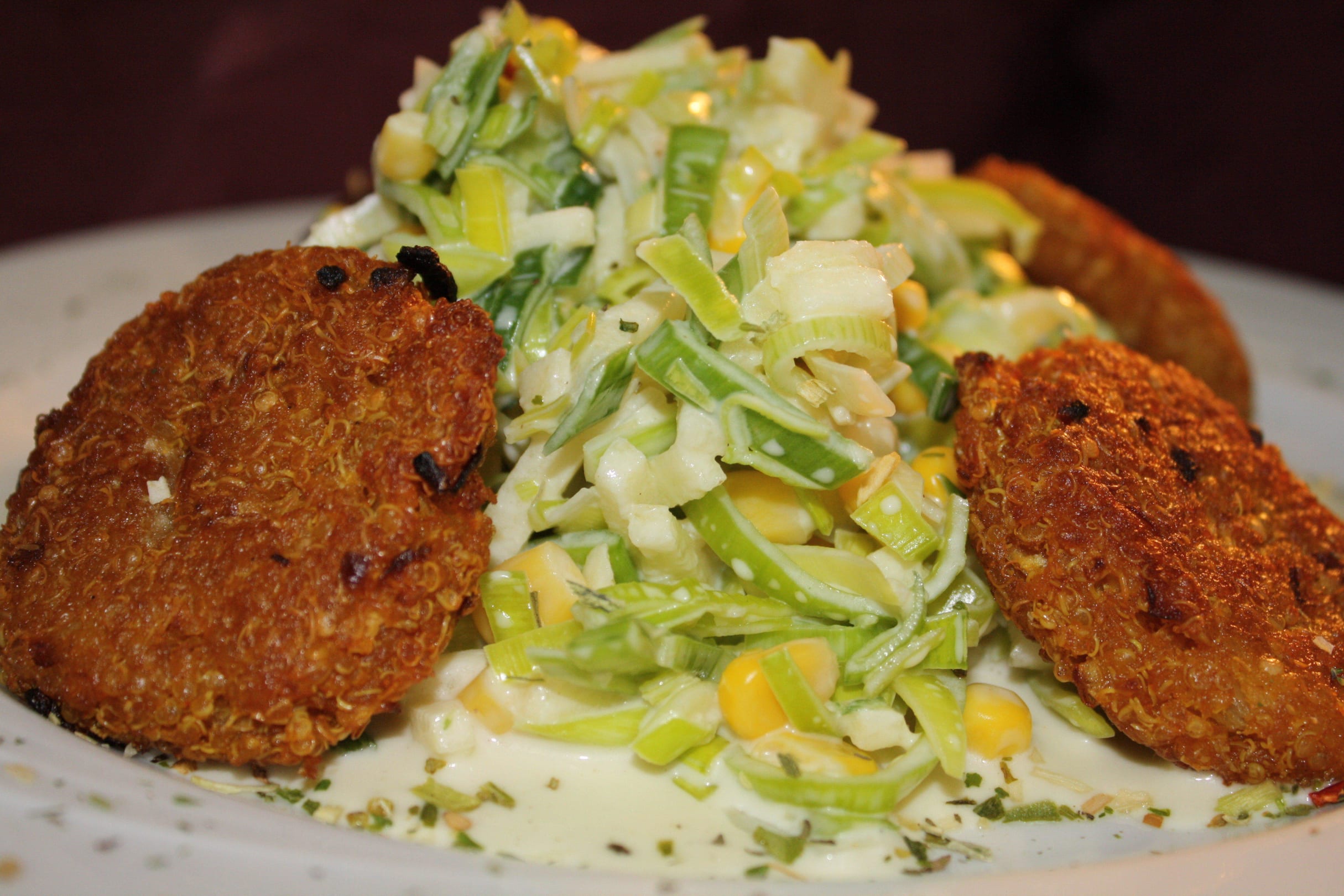 Quinoaplätzchen auf Apfel-Lauchsalat