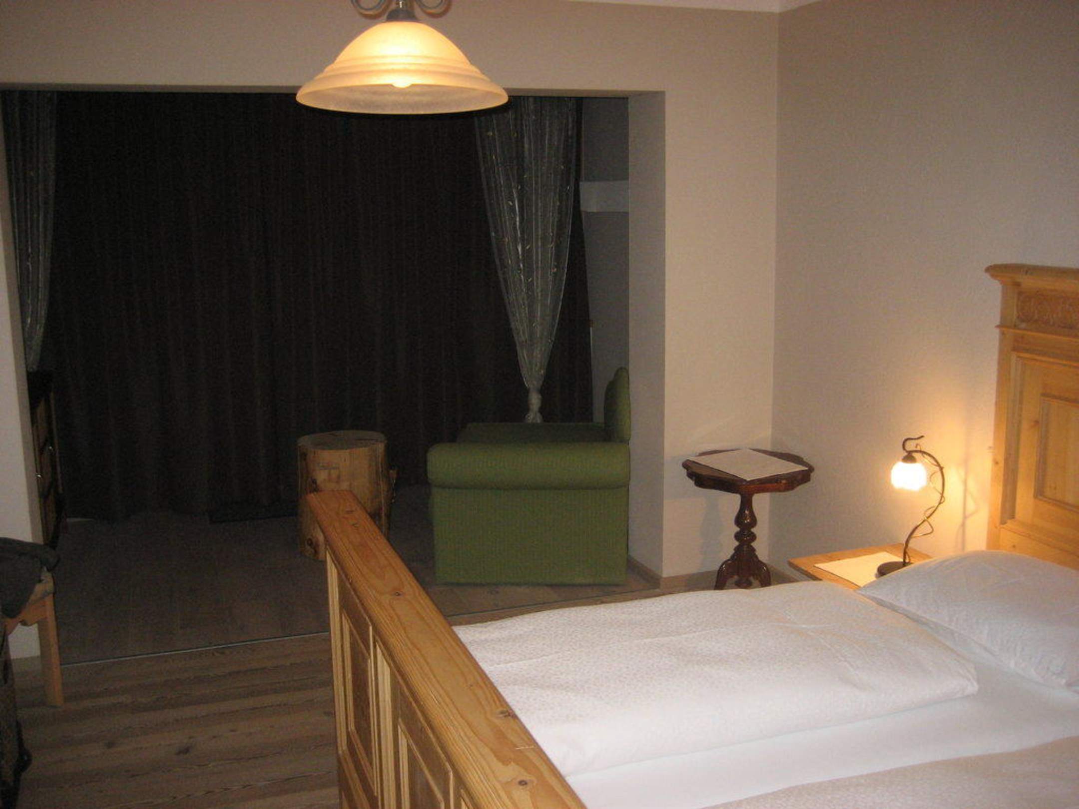 DoppelzimmerSitzecke mit Loggia im Dunkeln wegen fehlender Lampen. Tagsüber schöner Ausblick aufs Tal.