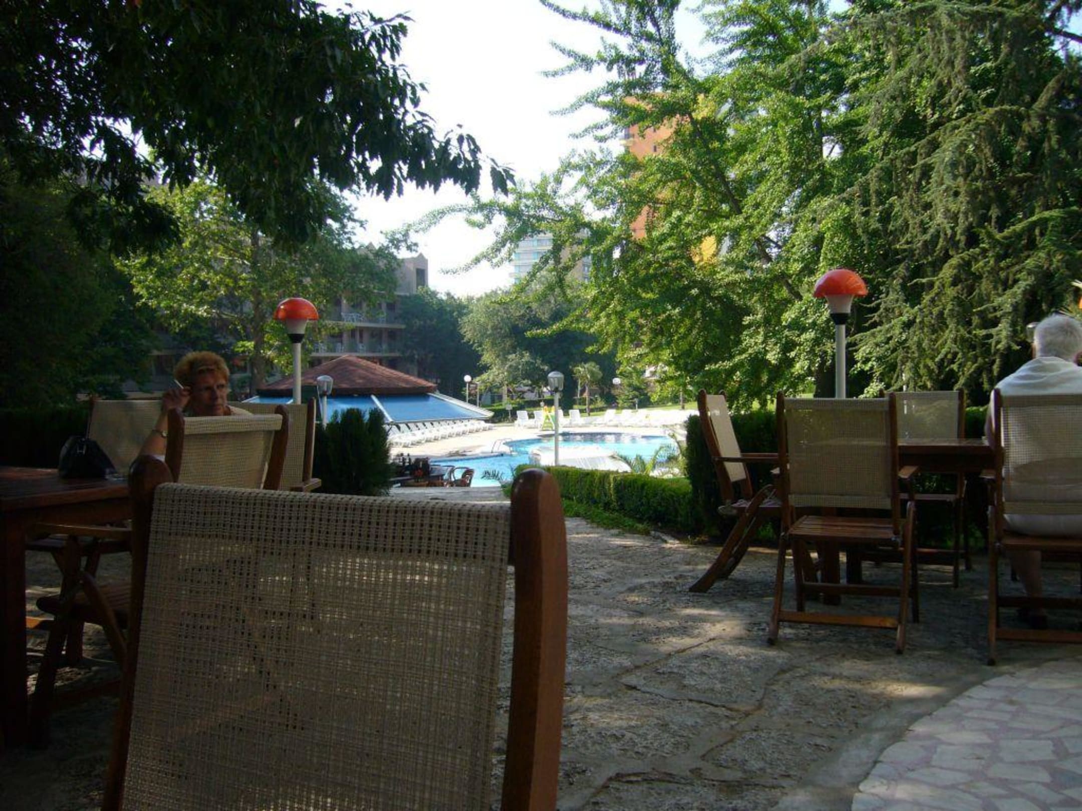 Restaurantterrasse mit Blick auf Poolanlage