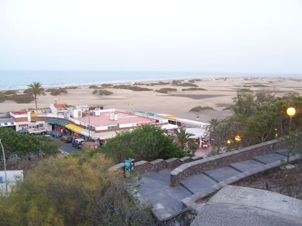 Blick von der Treppe hinterm Peru auf das Café Mozart / Dropzone und die Dünen.