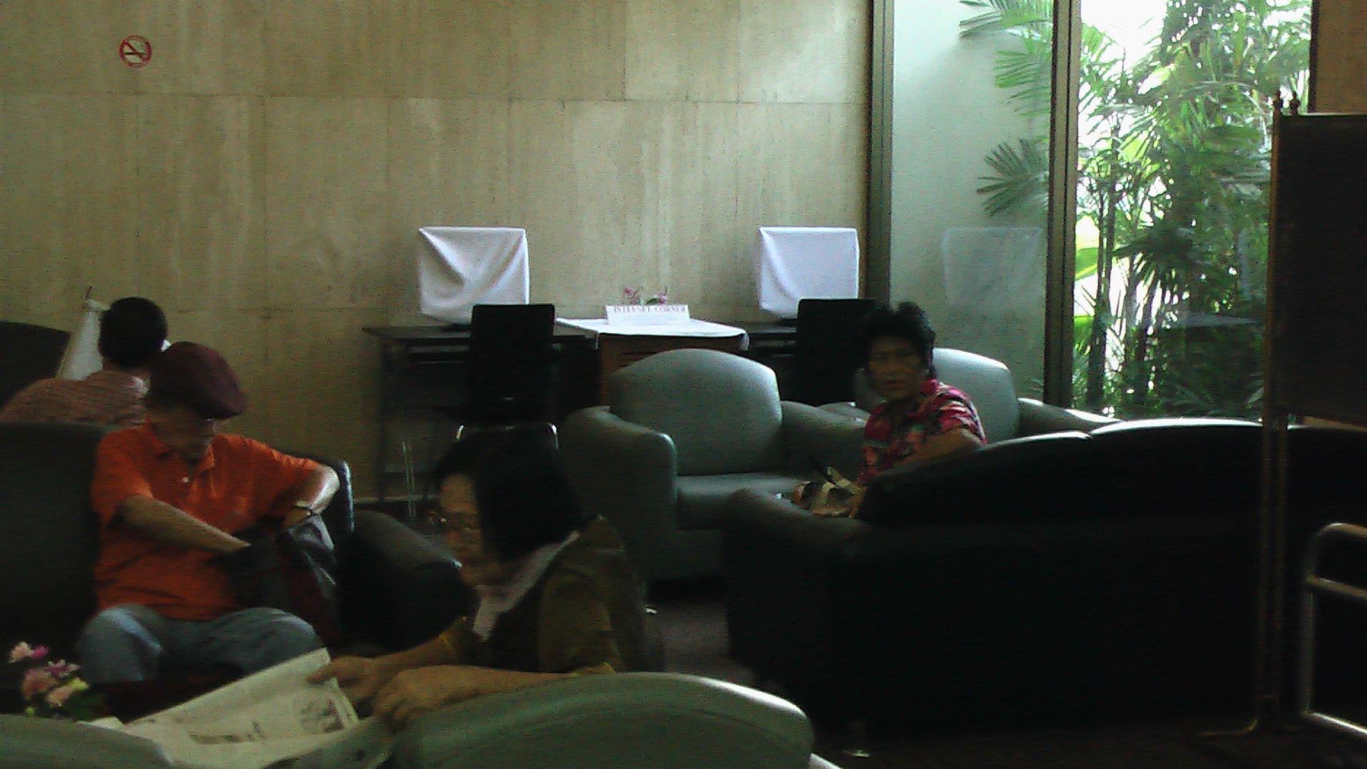 In der Lobby sind rechts und links vom Eingang jeweils Sitzplätze mit Tisch.