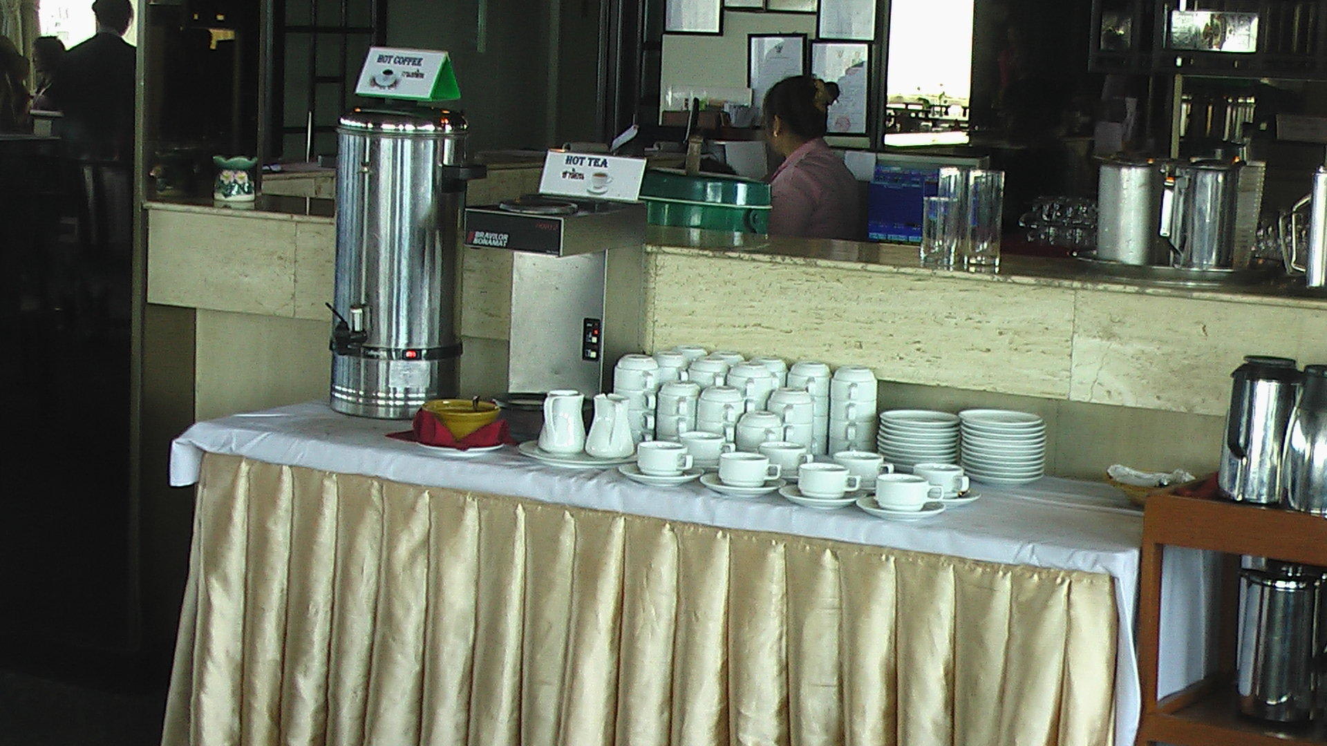 Kaffee und Tee setehn neben einander --- Tassen und Untertassen mit kl. Löffel und Zucker