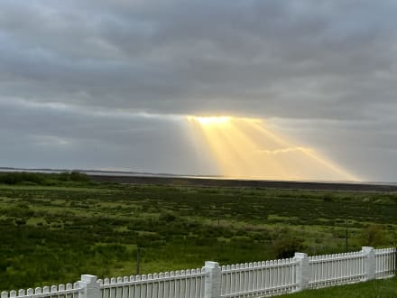 Blick vom Hotel in die Salzwiesen. Im Hintergrund die Insel Föhr.