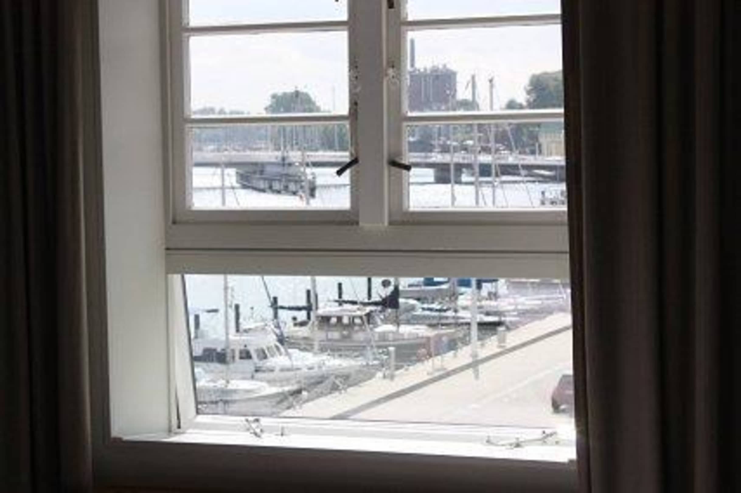Blick aus dem Bettganz bequem auf Hafen und Hafenpromenade schauen -