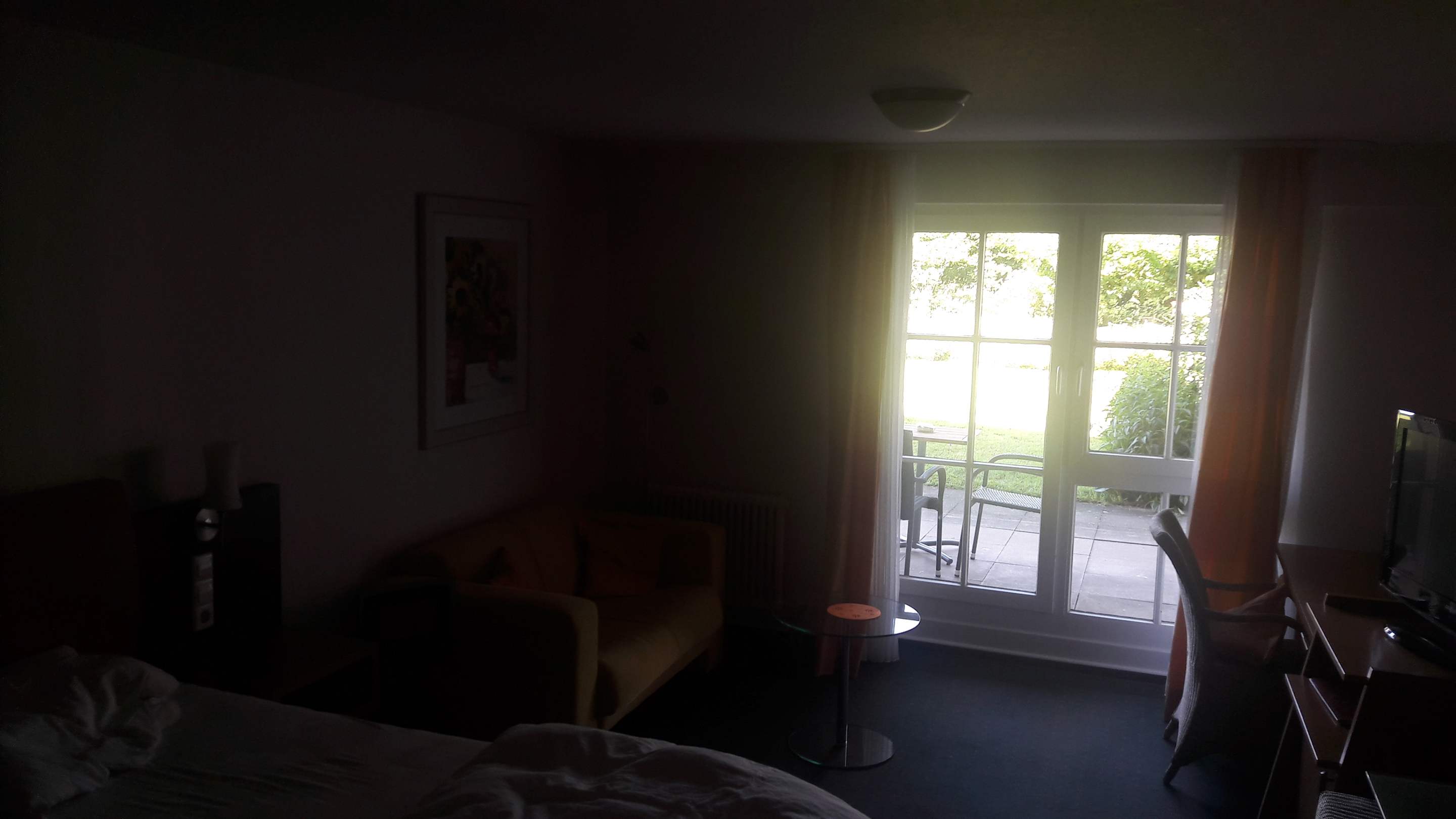 Zimmer mit Terrasse. Bett, Sofa, TV, ...