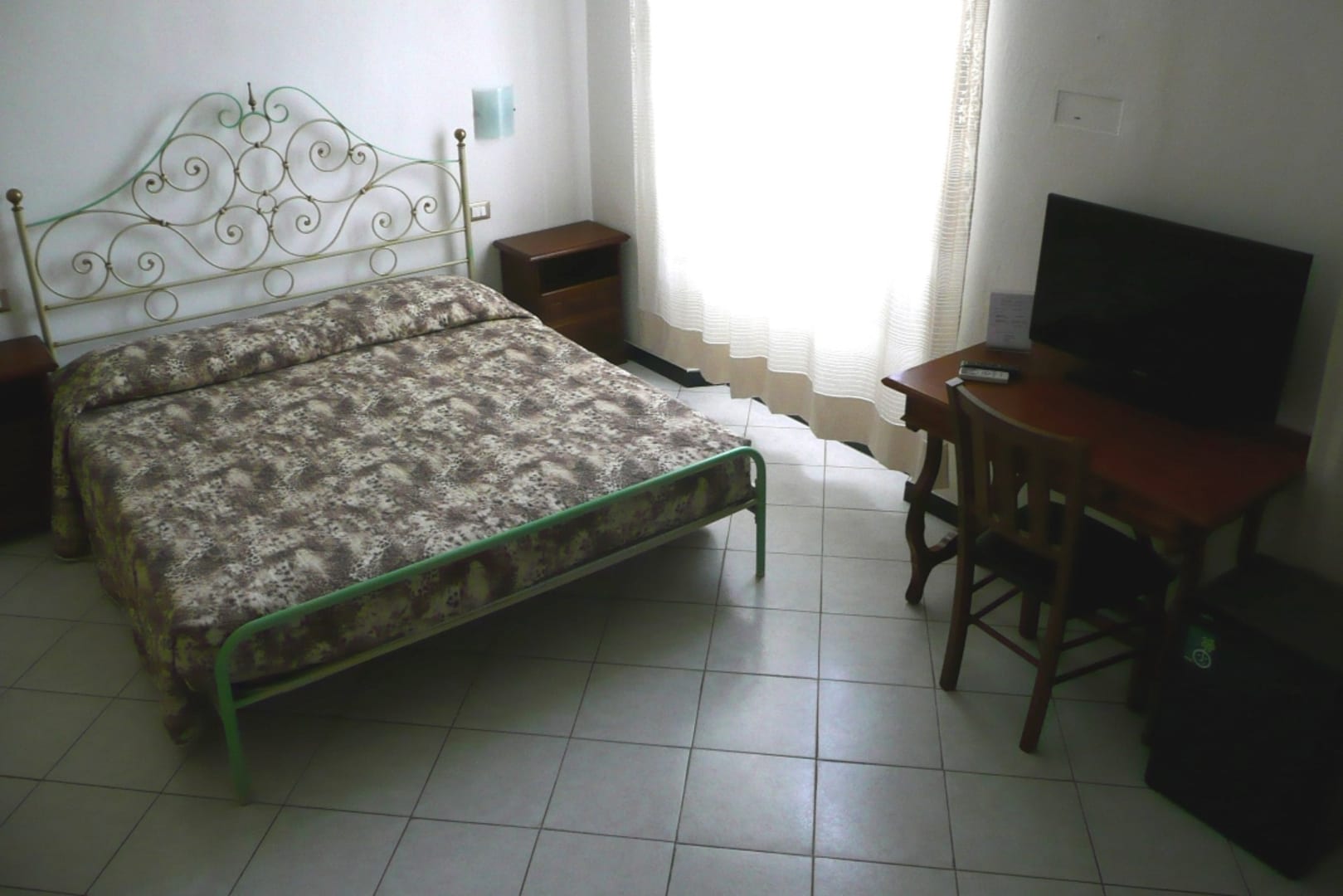 Eisenbettgestell und Biedermeierschreibtisch.