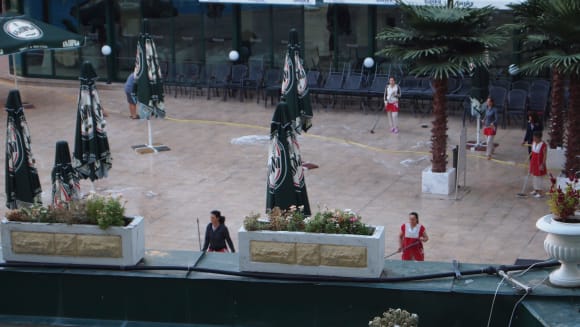 Morgendliches reinigen des Poolbereichs