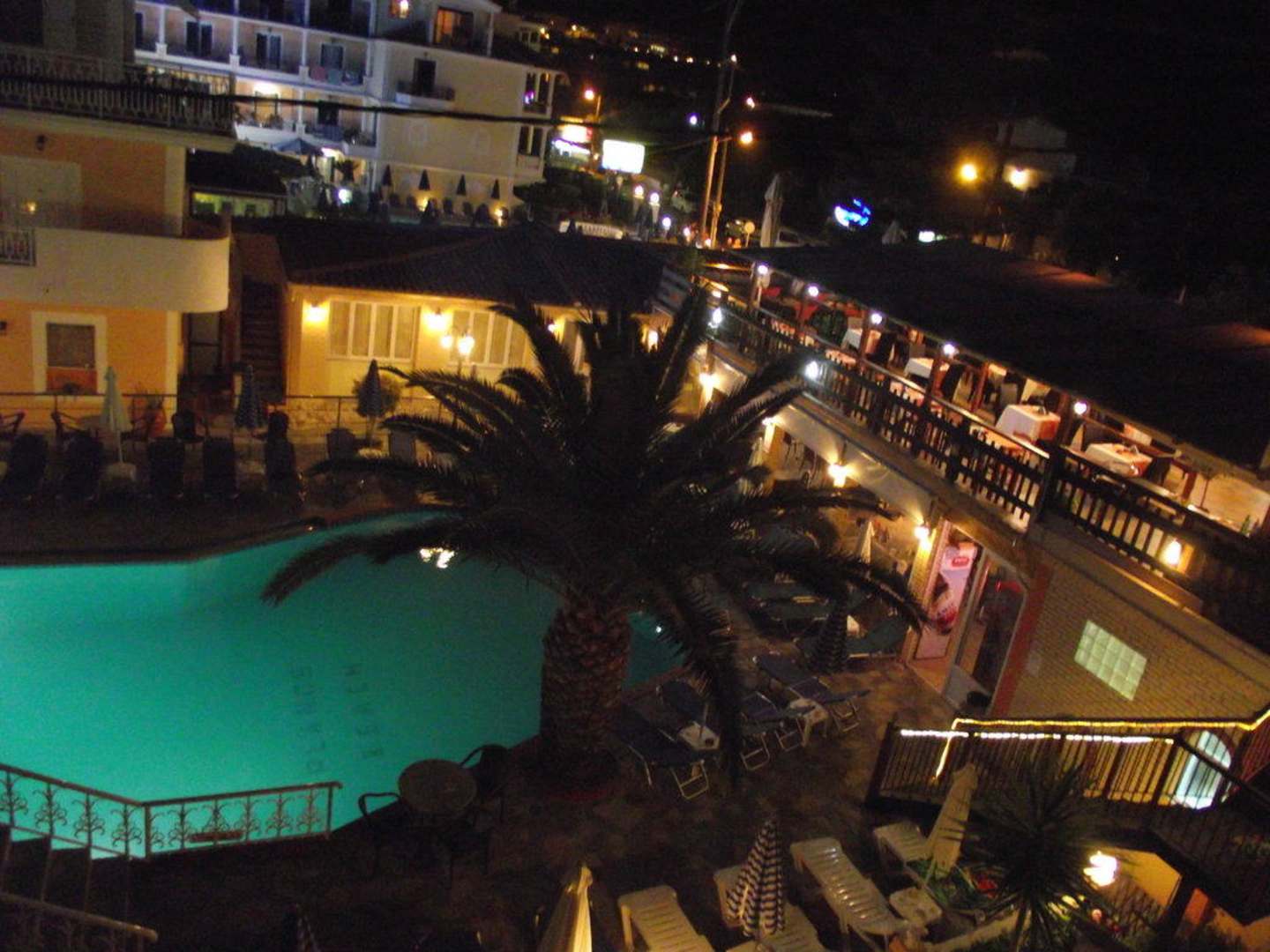 widok nocą z pokoju na basen