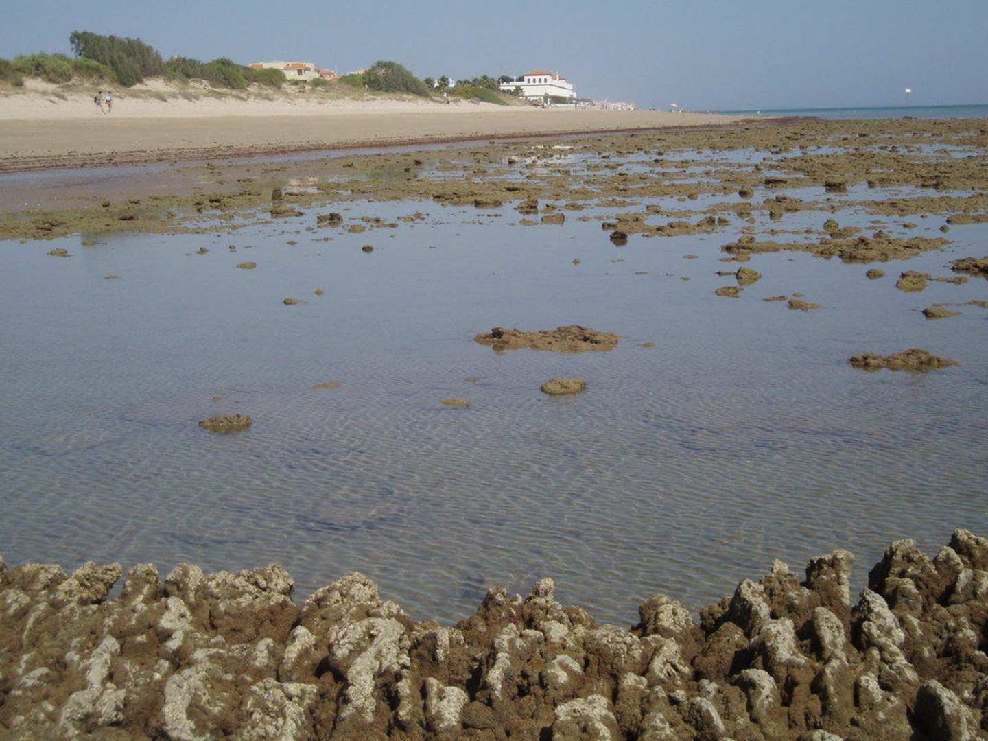 Bei einem Spaziergang auf den Mauern der Corrales ergab sich der Blick über den Strand bei Ebbe auf das Hotel