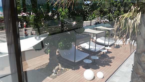 Sonnenterrasse Blick auf Poolanlage mit dn Bali Beds