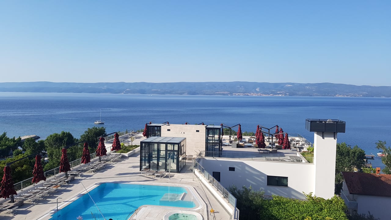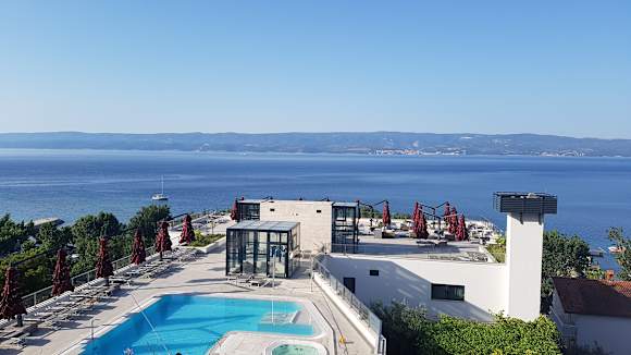 AusblickBlick vom Balkon im 7. Stock über den Pool und die Dachterrasse Richtung Meer. Hinten sieht man die Insel Brac.
