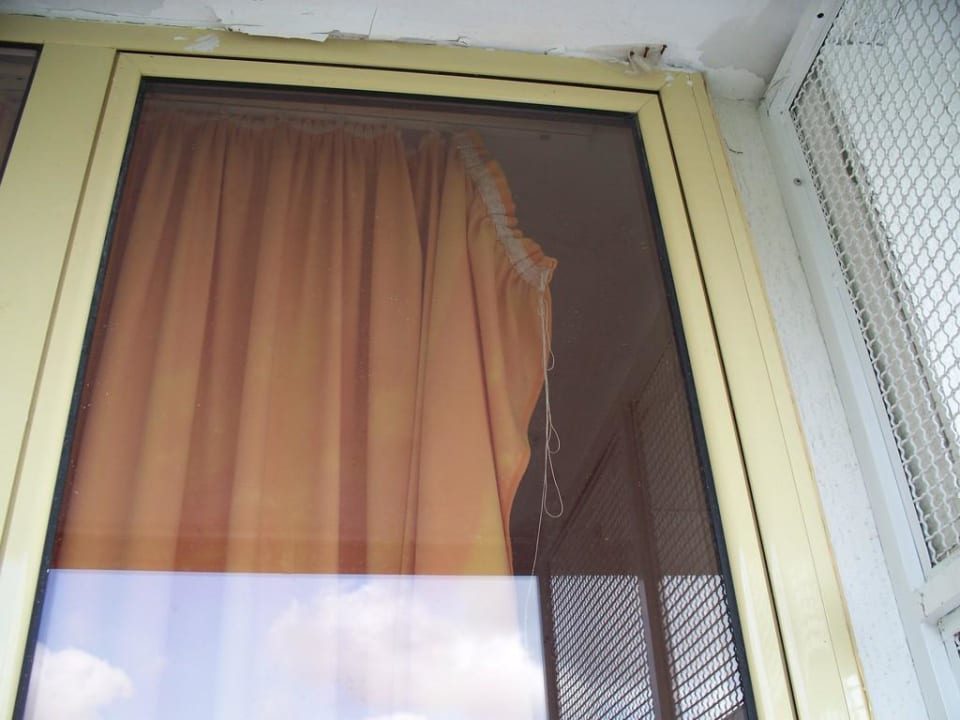 Blick vom Balkon auf Fenstervorhang
