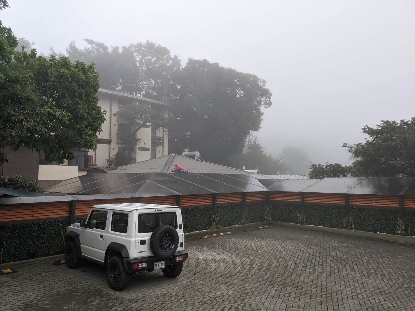 Parkplatz mit dem Gebäude mit den Zimmern im Hintergrund
