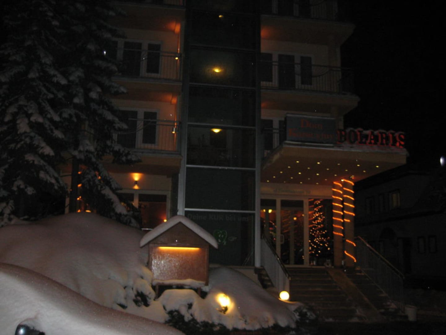 Vorderseite des Hotels bei Nacht