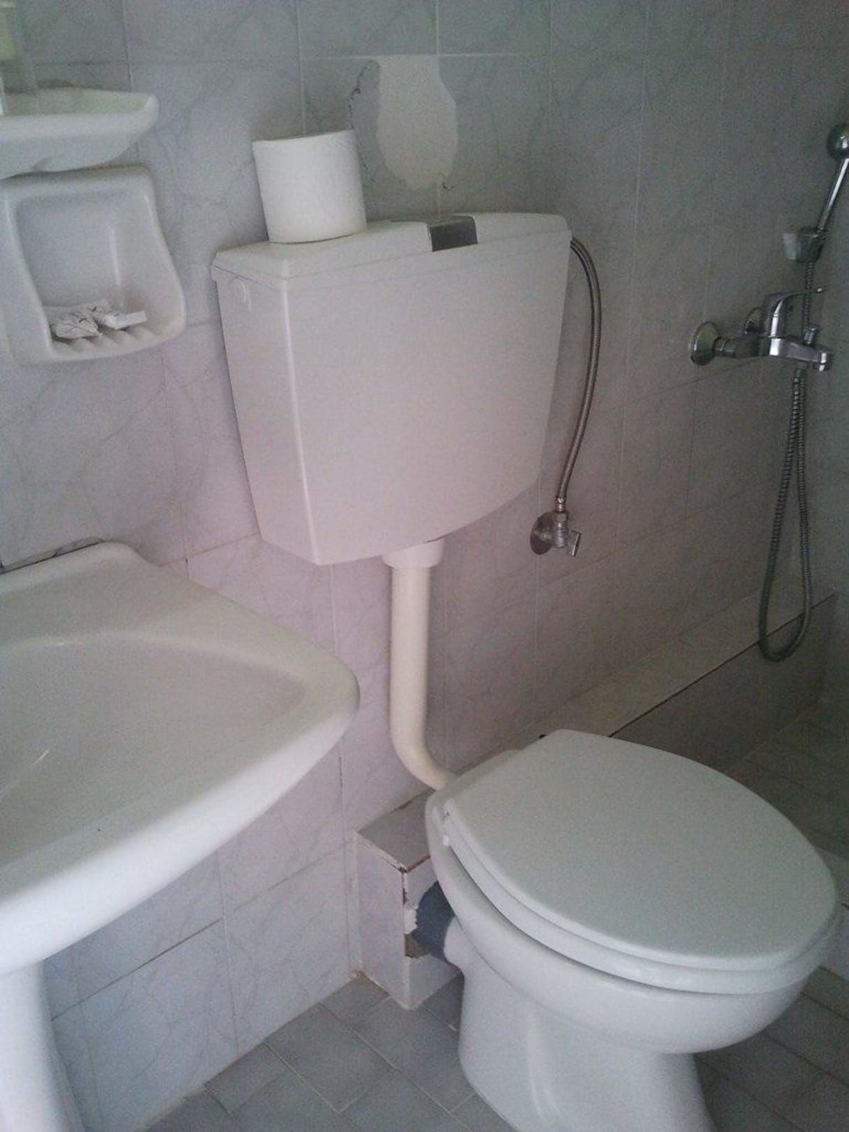 Baufälliges Badezimmer mit EkelgarantieEs fehlen nicht nur allerlei Fließen, auch der Putz brökelt ordentlich im Badezimmer. Bei genauerem Hinschauen (empfiehlt sich nicht) entdeckt man auch hier lang angezüchteten Dreck in praktisch sämtlichen Fugen.