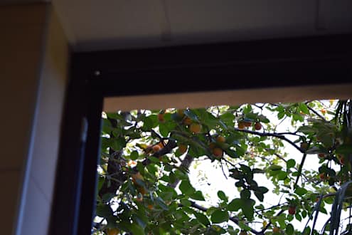 Blick vom kleinen Badezimmerfenster auf Bäume mit Früchten und Palmen.