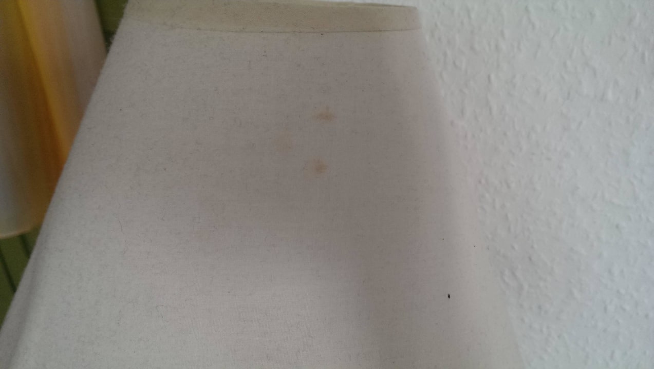 Nachttischlampenschirm Vergilbter und staubiger Lampenschirm, der nicht zur restlichen modernen und neuen Einrichtung passt.